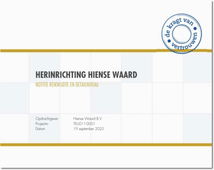 Op 22 september 2025 is de Notitie Reikwijdte en Detailniveau Herinrichting Hiense Waard (NRD) aangeboden aan de provincie Gelderland. Deze NRD is de inhoudsopgave voor het Milieu-Effect-Rapport dat opgesteld gaat worden. De provincie beoordeelt nu of met deze NRD alle relevante milieueffecten goed in beeld worden gebracht.Ook wint de provincie advies in bij de onafhankelijke Commissie voor de milieueffectrapportage. Deze commissie toetst of het MER aan de wettelijke vereisten voldoet.